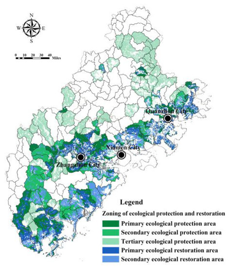 Based on the above analysis, from the perspective of coping with flood risk, the ecological space (woodland, grassland, wetland) in each sub-basin unit was divided into primary, secondary, and tertiary ecological protection areas and non-ecological protected areas. The space required for ecological restoration (cultivated land and bare land) was divided into primary, secondary ecological restoration areas, and non-ecological restoration areas (Table 4). Among them, the ecological space in the low supply–high demand sub-basin was the primary ecological protection area, and the most stringent ecological protection measures were implemented. The cultivated land and bare land in the sub-basin were the primary ecological restoration areas, and conversion of farmland to forest and vegetation restoration projects will be implemented. The ecological space in the high demand–high supply sub-basin was the secondary ecological protection area, and the cultivated land and bare land in the sub-basin were the secondary ecological restoration areas. The ecological space in the sub-basin of low demand–low supply was the tertiary ecological protection area. There was no ecological protection area and ecological restoration area in the high supply–low demand sub-basin. Figure 15 shows the zoning management plan of ecological space in Fujian Delta used to cope with flood risk. It can be seen that the primary ecological protection areas and ecological restoration areas were mainly located in the coastal and Zhangzhou Jiulong River downstream areas. The secondary and tertiary ecological protection areas were mostly located in the middle and upper reaches of rivers.