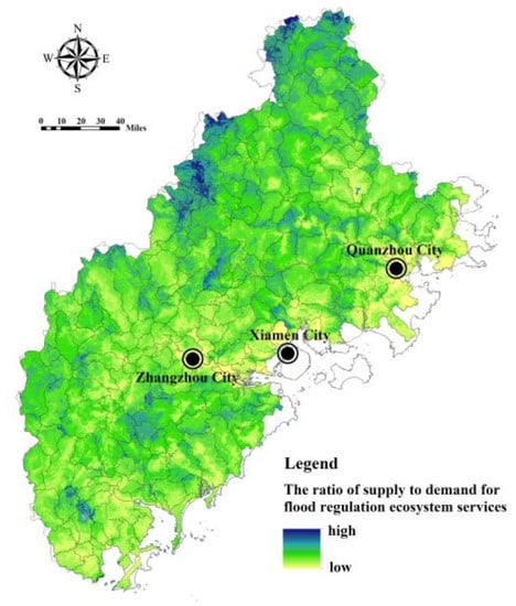 Global warming has led to frequent extreme rainfall, and floods have become one of the major disasters threatening the security of urban and rural human settlements [1,2]. In 2020, the frequency of global flood disasters accounted for 61.66% of the total annual frequency of natural disasters [3]. With the rapid development of urbanization, the demand for flood regulation (FR) service in urban and rural areas is constantly increasing [4,5]. Only relying on engineering measures to deal with flood disaster risk will lead to huge investment and a limited scope of regulation [6,7,8]. It is increasingly recognized that ecosystems can play an important role in regulating surface runoff and reducing the risk of rainstorms and floods [1,9]. Ecosystem services (ES) are the conditions and processes that maintain and satisfy human life [10,11]. The supply of ES are the products provided by the ecosystem for human welfare, and the demand for ES is the consumption of the products provided by the ecosystem [11]. Ecological and environmental problems are fundamentally caused by imbalances in the supply and demand of ES [11]. The flood regulation ecosystem services (FRES) is an important part of ES [1,6]. It reflects an ecosystems’ ability to reduce flood hazards caused by heavy precipitation and upstream discharge and is mainly determined by surface characteristics such as soil, land use, and vegetation cover [12,13]. Recently, the research on flood risk management based on FRES has become a hot topic for scholars in related fields [12].