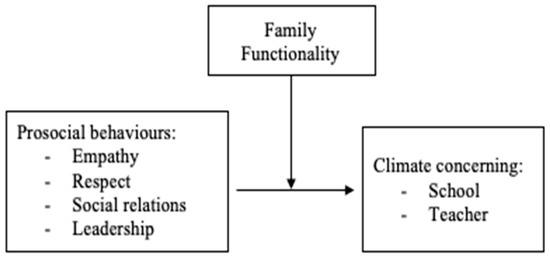 Hypothetical model of the moderation of Family Functionality in the relationship between Prosocial Behaviour and School/Teacher Climate.