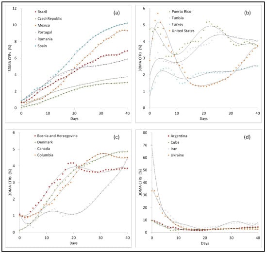 Representative national 3DMA-CFR curves for COVID-19 epidemics. (a) The arising curves without turning points. (b) The curves containing similar falling zones marked with the first high turning points and the second low turning points. (c) The curves showing the first falling and then the second rising based on the low turning points. (d) The curves showed the first falling and then the second massively rising based on the low turning points.