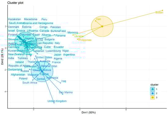Cluster analysis based on seven parameters including T1, T2, CFR1, CFR2, ΔT, ΔCFR, and SFZ showed that all the falling zones within 3DMA-CFR curves of COVID-19 epidemics for 71 nations and regions can be divided into three categories. Cluster 1 marked with lowest CFR2 included 51 nations and regions, such as Austria, Canada, and Denmark. Cluster 2 marked with moderate CFR2 included 16 nations and regions, such as Australia, China, and USA. Cluster 3 marked with highest CFR2 included four nations and regions, such as Iran, Sudan, and Ukraine (Figure 4). Kruskal–Wallis H test analysis revealed that there was significant difference for all seven parameters among three groups of different clusters (p < 0.05) (Table 2).