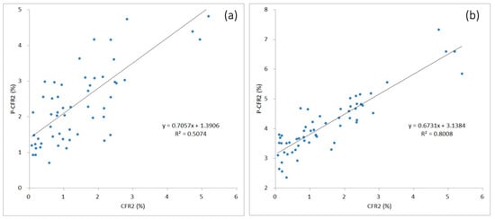 Prediction performances of CFR2 with two models for initial COVID-19 epidemics for internal evaluation. CFR2 values: calculated from existing national CFR curves. Predicted CFR2 (p-CFR2) values: estimated from model M1 (a) and model M2 (b).