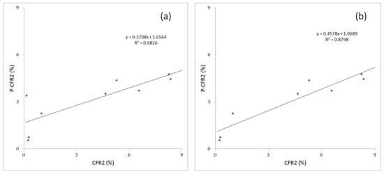 Prediction performance of CFR2 for initial COVID-19 epidemics with established model M1 for nine nations (a) or eight nations (b) in external evaluation. CFR2 values: calculated from the existing national CFR curves. p-CFR2 values: predicted from model M1.