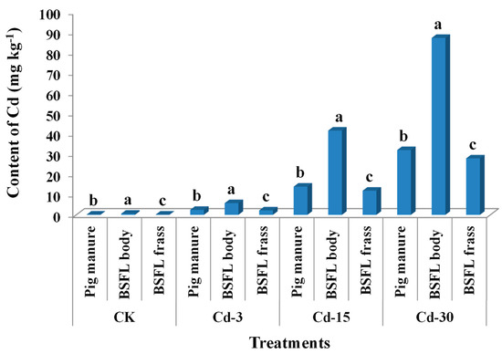 Previous studies have shown that BSFL have strong tolerance to heavy metals in diverse organic waste [13,14,15]. However, heavy metals derived from animal manure will remain in the bodies and frass of BSFL after manure transformation, which brings risks to the further utilization of larval biomass and frass. Cadmium (Cd), in particular, a common metal existing in animal manure, can be highly accumulative in BSFL bodies [14,16,17] and, thus, merits considerable attention. On the one hand, when using BSFL bodies as animal feed, excessive Cd in BSFL bodies would cause Cd poisoning of animals and reduce production performance. On the other hand, when using BSFL frass as organic fertilizer in the soil, excessive Cd in soil would inhibit the normal growth of plants.