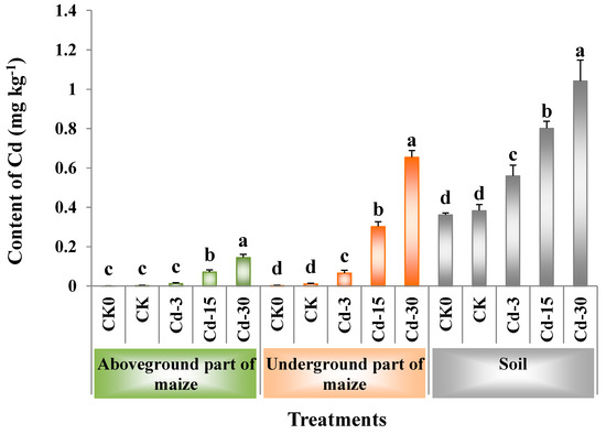 Figure 2 showed the contents of Cd in the soil, as well as the aboveground and underground parts of maize. When no exogenous Cd was added, the application of BSFL frass had no significant effects on the contents of Cd in the maize plants and soil (comparison between CK and CK0). With the increase in the amount of exogenous Cd added, the Cd contents in the aboveground and underground parts of maize increased by 3.3–47.0-times and by 4.9–57.6-times, respectively, compared with the CK sample, while those in the soil increased by 0.5–1.7-times. Among all the treatments, Cd-30 had the highest contents of Cd in the aboveground (0.15 mg kg−1) and underground (0.66 mg kg−1) parts of maize, as well as in the soil (1.04 mg kg−1).