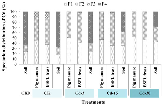 The changes in Cd speciation in soil, pig manure, and BSFL frass under different treatments. F1: weak acid-soluble fraction; F2: reducible fraction; F3: oxidizable fraction; F4: residual fraction.