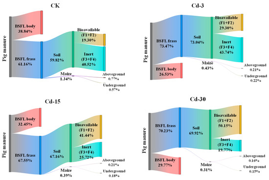 After being transformed by BSFL, Cd in pig manure was partially transferred into BSFL frass (61.16–73.47%) under different treatments and the rest was transferred into BSFL bodies (26.53–38.84%) (Figure 4). This process, to some extent, reduced the environmental risk of pig-manure-sourced Cd entering the soil and crops, but at the same time, increased the potential risk associated with Cd when using larvae as animal feed ingredients.