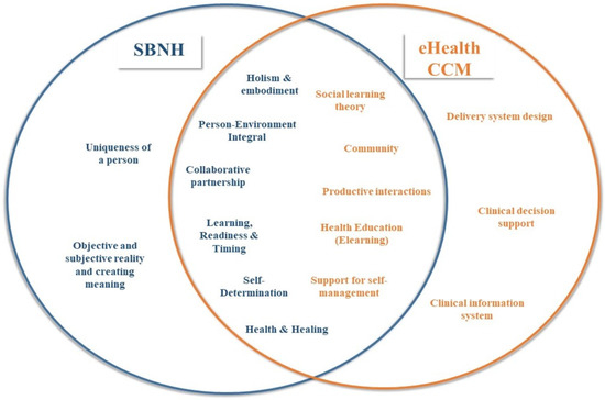 Both models describe human beings as holistic. The eHealth CCM recognizes the central role of the patient in his or her care, a role that implies responsibility for his or her own health. Similarly, the SBNH views the individual as a unique being who functions as an integrated whole and has the capacity for growth, transformation and self-healing [10].