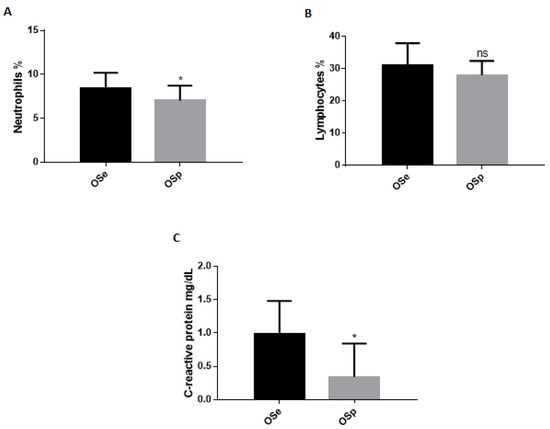 White blood cells and C-reactive protein in sedentary obese children (OSe) compared to obese children who played sport (OSp). (A) Neutrophils, (B) Lymphocytes, (C) C-reactive protein. The data are expressed as the means ± SDs. The significance was determined by the Student’s t-test: * (p < 0.05), which represents significance compared to sedentary obese children, ns (p > 0.05), not significative compared to sedentary obese children.