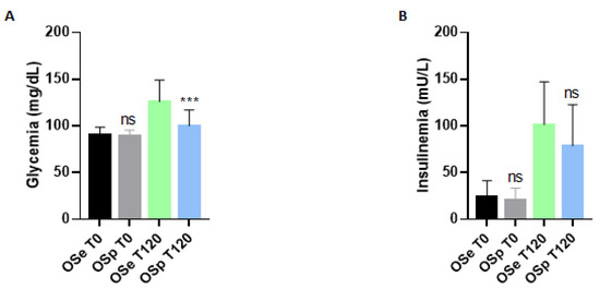 Determination of glycemia and insulin levels in sedentary obese children (OSe) compared to obese children who played sport (OSp). (A) Glycemia, (B) Insulin. Data are expressed as the means ± SDs. The significance was determined by the Student’s t-test: *** (p-value < 0.001) and ns (p > 0.05), not significative compared to sedentary obese children.