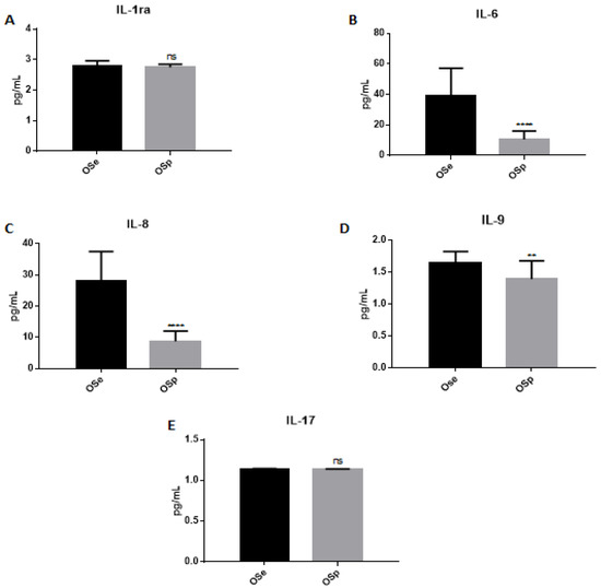 Evaluation of interleukins level in the serum of sedentary obese children (OSe) compared to obese children who played sport (OSp). (A) IL-1ra, (B) IL-6, (C) IL-8, (D) IL-9, (E) IL-17. The data are expressed as the means ± SDs. The significance was determined by the Student’s t-test: **** (p < 0.0001) and ** (p < 0.01) represent significance compared to sedentary obese children, ns (p > 0.05), not significative compared to sedentary obese children.