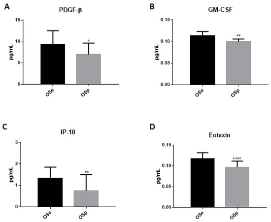 Dosage of cytokines and chemokines in the serum of sedentary obese children (OSe) compared to obese children who played sport (OSp). (A) PDGF-β, (B) GM-CSF, (C) IP-10, (D) Eotaxin. The data are expressed as the means ± SDs. The significance was determined by the Student’s t-test: * (p < 0.05), ** (p < 0.01) and **** (p < 0.0001) represent significance compared to sedentary obese children.