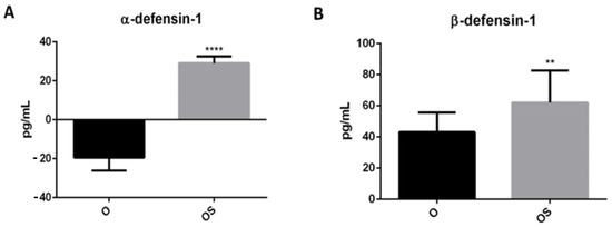 Accumulation of defensins in serum of sedentary obese children (OSe) compared to obese children who played sport (OSp). (A) α-defensin-1 and (B) β-defensin-1. The data are expressed as the means ± SDs. The significance was determined by the Student’s t-test: ** (p < 0.01) and **** (p < 0.0001), which represent significance compared to sedentary obese children.