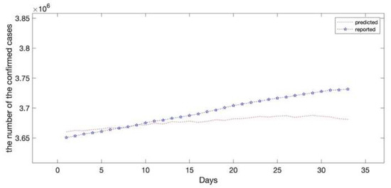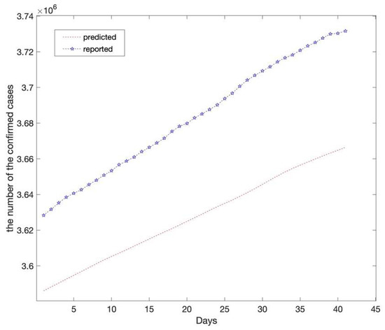 Compares the reported and predicted data (the long short-term memory model). The red dotted line depicts the long short-term memory model’s prediction results on the test set which reveals that the number of confirmed cases in California will reach 3,666,418 on 25 April 2021. The asterisk line depicts the reported number of confirmed cases in California with 3,731,677 on 25 April 2021.