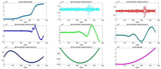 The results of the original data decomposed by ensemble empirical mode decomposition. (a) The picture depicts the original data (the number of confirmed cases from 21 January 2020, to 25 April 2021). (b–i) The pictures depict the decomposed sequences (IMF1, IMF2, IMF3, IMF4, IMF5, IMF6, IMF7) and the residual by ensemble empirical mode decomposition.