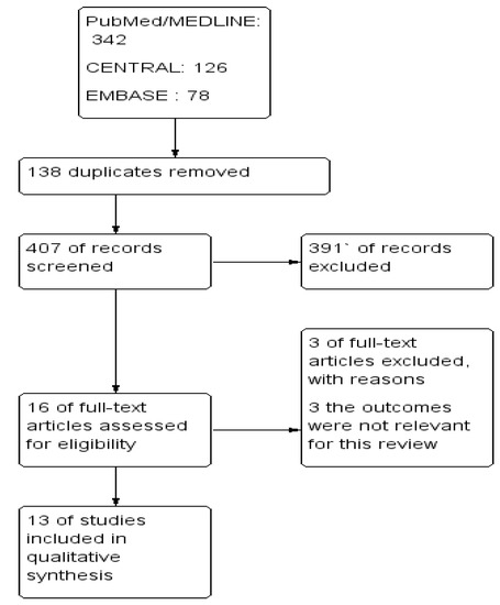 A total of 546 studies through the databases were searched, of which, 16 full-text studies were assessed further for eligibility and 13 of them fulfilled the inclusion criteria for further analysis (Table 2).