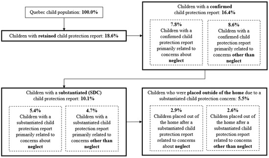 As in other North American jurisdictions, child protection intervention in Quebec is meant to be exceptional. Concerns reported to the child protection system are funneled through a series of decision points that determine the nature and scope of the concern and what services or interventions may be necessary to “protect children whose security or development is or may be in danger” [61]. The provincial Youth Protection Act (YPA) defines these concerns as follows: abandonment, psychological ill-treatment, sexual abuse, physical abuse, serious behavioral disturbance, neglect, serious risk of physical abuse, serious risk of sexual abuse, and serious risk of neglect [61]. The definition of “neglect” differs from the other forms of possible concerns in that it refers to caregivers “failing” to meet a child’s needs rather than committing an act of maltreatment [61]. In Quebec and many other jurisdictions, neglect is associated with chronic poverty and other forms of unmet needs in families and communities rather than immediate protection concerns [4,62,63,64]. Accordingly, in this study, we distinguish between neglect and non-neglect forms of child protection concerns for some stages of child protection involvement. The designation of “risk of neglect” is included in the neglect category, as is risk of physical or sexual abuse in those categories.