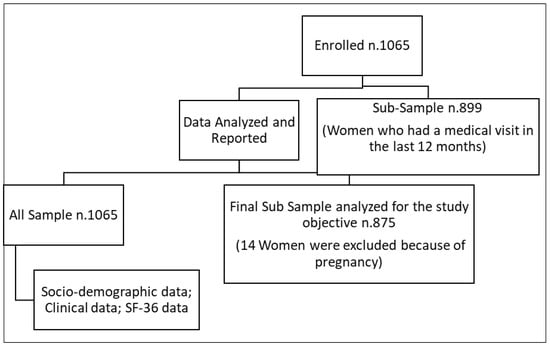 This was an online cross-sectional survey which included standardized measures, and 1065 records were collected at the closing date of the recruitment process. The geographical distribution of responses was 40% from Northern Italy, 22% from Central Italy and 38% from Southern Italy and the Islands. It was compatible to the distribution of the Italian female population in the three territorial areas: the North, Center, South, and the Islands, according to the Italian National Institute of Statistics (ISTAT) []. To the best of our knowledge, this was the first study to investigate the quality of life among women with endometriosis during the COVID pandemic in Italy.