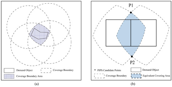 In this study, the polygon intersection point set (PIPS) [30] was introduced to obtain candidate points in the research area. PIPS ensures that at least one optimal candidate point can cover a demand area. Moreover, it can transform an infinite set of candidate points into a finite set of points. Thus, the spatial continuous location problem can be simplified into a binary problem for calculating candidate points. A binary coverage model (complete coverage or no coverage) was therefore adopted to calculate the candidate points. The coverage range of each candidate point has a certain limit in terms of distance, but the candidate point should completely cover the corresponding demand area (a polygon). The regional boundary that completely covers an area of demand is called the coverage boundary (Figure 2a). Adjacent demand objects may have overlapping coverage boundaries; in this study, the overlapping area was defined as the equivalent covering area. Any point within the equivalent coverage area should completely cover two adjacent demand objects. Setting candidate points in such a region can improve the coverage efficiency and narrow the scope of the solution [30]. Therefore, to ensure that high-risk areas are covered by more fire stations, the candidate points for PIPS were set in the equivalent coverage area (Figure 2b).