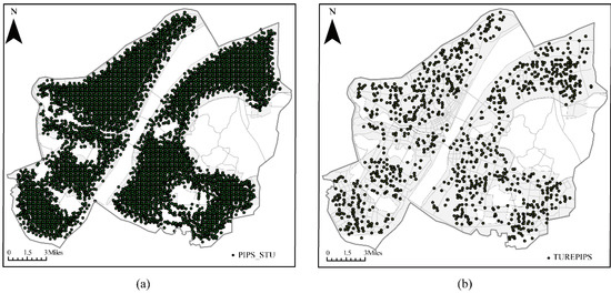 The concept of PIPS was utilized to calculate the candidate locations for a fire station. However, to comply with urban fire protection planning regulations, the candidate locations determined by the PIPS must meet the spatial distribution characteristics of fire stations. For example, the fire station should be located in an area with several adjacent streets to ensure that the fire engine can quickly move. Inflammable and explosive chemical points need to be covered by a fire station within 200 m, and the distance between fire stations and public buildings with large populations, such as hospitals, schools, kindergartens, nurseries, theaters, or shopping malls, should be not less than 50 m. Therefore, the locations of fire stations should further constrain these spatial distribution characteristics to avoid inappropriate candidate locations. Subsequently, network analysis was used to achieve the constraints of the above spatial characteristics. A total of 6259 locations were obtained with PIPs (Figure 4a); however, only 1432 locations were retained after these spatial constraints were included (Figure 4b).