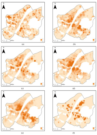 Figure 5. Kernel density distribution diagram of various fire risk factors: (a) flammable and explosive; (b) vulnerable population; (c) crowded population; (d) key protection; (e) general fire; (f) emergency risk aversion.