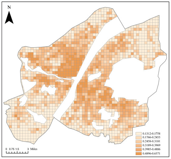 The standardized values of all factors are superimposed pair by pair to obtain comprehensive evaluation results for each grid. The equation used for summing factors is as follows: