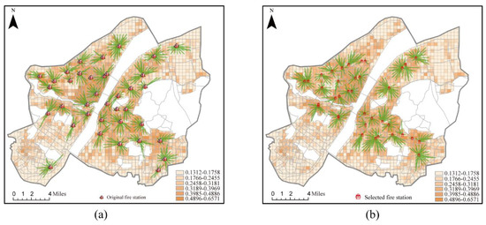 Figure 10. Coverage of fire stations considering existing stations. (a) Location optimization by the MCM; (b) location optimization by BCM.