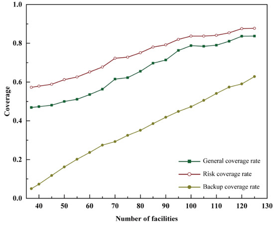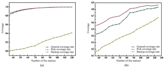 When the backup coverage model was adopted, the general coverage rate, risk coverage rate, and backup coverage rate increased as the number of facilities increased. The results (Figure 11b) indicate that the risk coverage rate was consistently higher than the general coverage rate and backup coverage rate. Moreover, with the increase in the number of fire stations, all three types of coverage increased. This shows that the backup coverage model can improve the backup coverage of the demand areas. With a total of 95 fire stations, backup coverage could be provided to more than half of the demand areas, improving security in the higher-risk areas. With 115 fire stations, the general coverage rate and risk coverage rate remained the same, while the backup coverage rate continued to increase. This result further confirmed the purpose of proposed model as improving the backup coverage in high-risk areas.