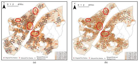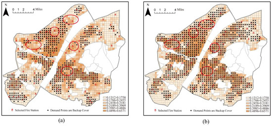 When the number of fire stations was set to 115 (including the 37 existing fire stations) using the maximal coverage model, a demand area of 99.54% was covered by one fire station and 40.82% of the area was covered by more than one fire station. Therefore, the demand area was almost completely covered. However, the backup coverage for high-risk areas was still insufficient (Figure 10a). For example, high-risk areas (red circle in Figure 10) should contain more fire stations when backup coverage is not available. At this point, 44.29% of the fire risk in the study area was under backup coverage. However, when the number of fire stations was set to 115 (including the 37 existing fire stations) using the backup coverage model, 85.40% of the demand areas were covered, and 57.38% of the demand areas were covered by more than one fire station (Figure 10b). Almost all of the demand areas with backup coverage were located in areas with high fire risk, and the total risk of the area covered by backup coverage was 278.27, with backup coverage of 69.10%. Under the same conditions, the total fire risk in the demand area covered by the backup increased by 24.81%. This result reflected the enhancement in the coverage of higher fire risk areas under the backup coverage model.
