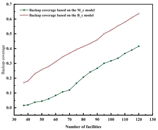When selecting locations for building new fire stations in a city, the existing fire stations are crucial constraints. In this study, the addition of fire stations was designed, taking into consideration the existing fire stations. The performance of the maximal coverage model and the backup coverage model were analyzed using the same number of facilities (Figure 9). It was apparent that the backup coverage rate when using the backup coverage model was always greater than when using the maximal coverage model, particularly when increasing the number of fire stations. The proposed backup coverage model considered both the backup coverage and maximum coverage, while the maximum coverage model only considered once coverage. When the total number of fire stations was less than 65, the difference between the backup coverage rate in the two models was observed to continually increase. However, the backup coverage rate was still better under the backup coverage model (the backup coverage rate always remained higher than 14.5% compared with the maximum coverage model). However, the backup coverage rates of the two models were not saturated, indicating that backup coverage will continue to increase when the number of fire stations is increased under both models. The difference in backup coverage between the two models was the largest (19.08%) under 125 fire stations.