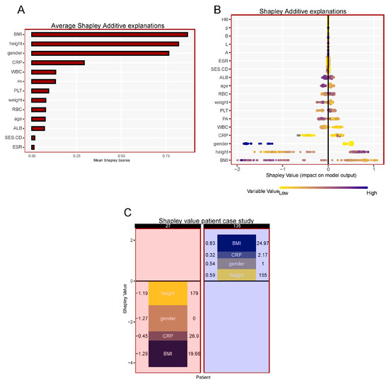 Consequently, SHAP analysis was used to further interpret the results of the LightGBM model for its optimal diagnostic performance by computing the contribution of each variable. The average Shapley scores plot ranked the variables from most important to least important in contribution to the patient’s sarcopenic status in Crohn’s disease. The four most important variables were BMI, followed by gender, height, and CRP, based on the LightGBM model (Figure 2A).