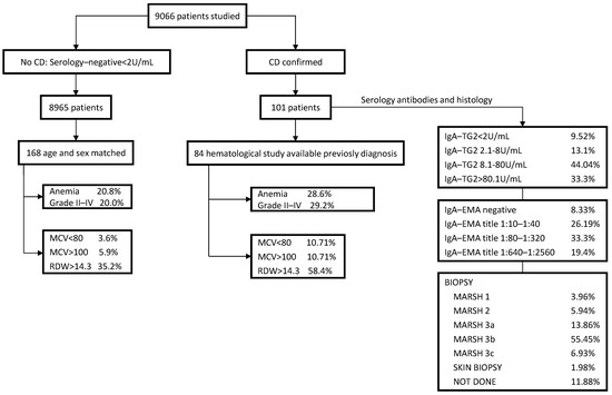- Balaban, D.V.; Popp, A.; Ionita Radu, F.; Jinga, M. Hematologic Manifestations in Celiac Disease-A Practical Review. Medicina 2019, 55, 373. [Google Scholar] [CrossRef]