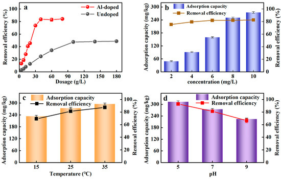Adsorption efficiency of ceramsite under different conditions. (a): Al-doped and undoped; (b): initial PO43−-P concentration; (c): temperature; (d): initial pH.
