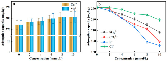 Coexisting ions existed in the actual water environment, which may interfere with the efficiency of the adsorbent to remove PO43−-P from the rainwater. Given that fact, in this study, the typical two cations (Ca2+, Mg2+) and four anions (SO42−, CO32−, F−, Cl−) were selected as coexisting ions to assess the effects of coexisting ions on PO43−-P adsorption. Figure 3a illustrated that the adsorption capacity of Al-ceramsite increased in the presence of Ca2+ and Mg2+, which had a facilitating effect on the adsorption of PO43−-P. However, SO42−, CO32−, F−, and Cl− can affect the adsorption of PO43−-P to compete with PO43− for the active adsorption site (Figure 3b). At the same concentration level, the existence of F− had a stronger inhibitory effect on the adsorption of PO43−-P than the other anions. When the initial concentration of F− was 10 mmol/L, the adsorption capacity decreased 38.65% compared to the control, where the inhibitory effect of anion on the adsorption of PO43−-P was achieved: F− > CO32− > SO42− > Cl−.