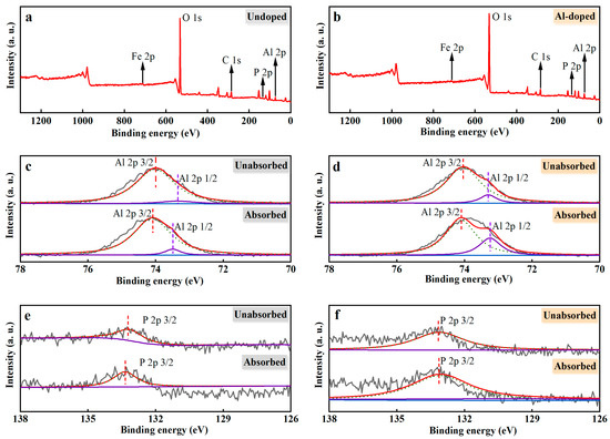 XPS spectra of ceramsite before and after adsorption. (a): widescan of undoped ceramsite; (b): widescan of Al-ceramsite; (c): Al elements spectra of Un-ceramsite; (d): Al elements spectra of Al-ceramsite; (e): phosphorus elements spectra of Un-ceramsite; (f): phosphorus elements spectra of Al-ceramsite.