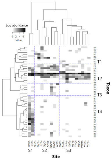Based on the similarity of their community compositions, the 20 reservoirs were divided into three clusters (S1–S3; Figure 2). Furthermore, the 52 taxa identified in the dataset were classified into four groups (T1–T4) based on similarities in their abundance and occurrence in the study reservoirs. The dominant taxon in all clusters was Chironomus spp.; however, the second dominant taxa varied by cluster, such as Limnodrilus spp., Micronecta spp., and P. paucidens in clusters S1 through S3, respectively. In group T4, cluster S1 (BnSn and JnCh) had greater taxonomic richness and abundance. The taxa in group T2 were widely distributed across the study reservoirs. Taxonomic abundance was low in T1 and T3.