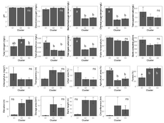 Differences between environmental variables between clusters classified in Figure 2. Different letters denote statistical differences based on Tukey’s HSD test (p < 0.05). Error bars indicate standard errors. ‘ns’ means no significantly different among clusters.