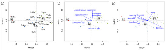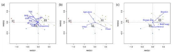 Biplots with 19 environmental variables in three categories on the NMDS ordination in Figure 4. (a) Physicochemical water quality variables, (b) land use types, and (c) geomorphological variables. DO: dissolved oxygen, BOD: biochemical oxygen demand, COD: chemical oxygen demand, TSS: total suspended solid, TN: total nitrogen, TP: total phosphorus, TOC: total organic carbon, WT: water temperature, EC: electric conductivity, Chla: chlorophyll-a, Urban: proportion of urban area, Agriculture: proportion of agricultural area, and Forest: proportion of forest landscape.
