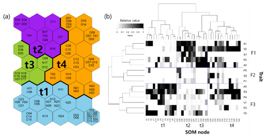 (a) Classification of taxa using self-organizing map (SOM) algorithms based on functional traits. Letters and numbers denote the individual taxa presented in the supplementary information Table S2. (b) Two-way classification of functional traits (vertical arrangement; groups F1–F3) and SOM units of traits (horizontal arrangement; clusters t1–t4) via hierarchical cluster analysis utilizing the Ward linkage method using Euclidean distance of classification. Weight vectors of SOM output units were used for the two-way cluster analysis. Abbreviations of traits are defined in Table 1.
