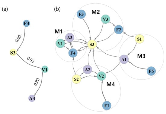 Results of the co-occurrence network analysis based on the association between traits. Link width is proportional to confidence. (a) Minimum support was 0.1, and minimum coefficient was 0.8. Numbers adjacent to links indicate confidence. (b) Minimum support was 0.05, and minimum confidence was 0.5. The circles denote modules of the traits (modularity: 0.32). The nodes indicate abbreviations of the traits listed in Table 1.