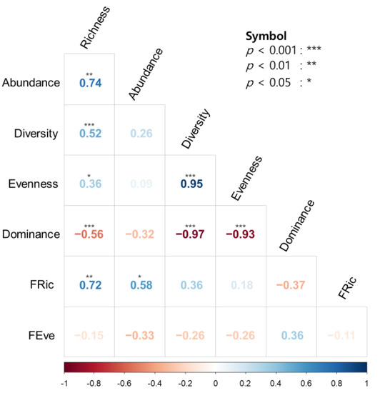 There was a positive correlation between richness and abundance (r = 0.74, p < 0.01), between richness and the Shannon diversity index (r = 0.52, p < 0.01), between richness and evenness (r = 0.36, p < 0.05), and between evenness and the Shannon diversity index (r = 0.95, p < 0.01) among the taxonomic diversity indices (Figure 8). Dominance was negatively correlated with richness, the Shannon diversity index, and evenness (r = −0.97–−0.56, p < 0.01). The functional community indices FRic and FEve were not significantly correlated with each other (r = −0.11, p = 0.62). Moreover, the functional diversity index FRic was positively correlated with richness (r = 0.72, p < 0.01) and abundance (r = 0.58, p < 0.05). However, FEve was not significantly correlated with taxonomic community indices (r = −0.33–0.36, p > 0.18), although it was weekly correlated with dominance (r = 0.36, p = 0.43).