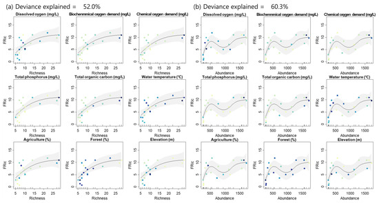 With the indices demonstrating significant correlations (Figure 8), the relationships between taxonomic and functional diversity indices were analyzed further by taking environmental factors into account (Figure 9). Richness and abundance explained 52.0% and 60.3% of the deviance in FRic by GAM, respectively. Environmental variables tended to increase or decrease as taxa richness, abundance and FRic increased. Taxa richness, abundance and FRic were positively correlated with BOD. TP was positively related to taxa richness and FRic, whereas these indices negatively correlated with proportion of forest and elevation.