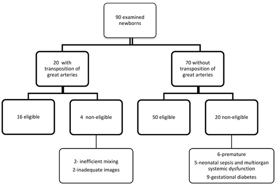 Control group (or neonates without TGA) inclusion criteria: full-term, healthy newborns (with no evidence of sepsis, renal impairment or other comorbidities) with no major congenital anomalies, with no history of maternal gestational diabetes and with normal echocardiography (newborns with a PFO or a small atrial septal defect (ASD) were not excluded). Thus, 70 newborns were included in the control group, and premature newborns, as well as those with cardiac and non-cardiac congenital anomalies, were excluded from the study (6 were premature, 5 had neonatal sepsis and multiorgan systemic dysfunction, and 9 had gestational diabetes) (Figure 1).
