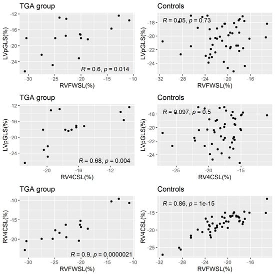 The linear correlations between LVpGLS, RVFWSL and RV4CSL in all samples are displayed in Table 2. LVpGLS was significantly positively correlated with both RVFWSL (p = 0.027) and RV4CSL (p = 0.002), while the RV-related longitudinal strain variables had a strong significant linear correlation between them (p < 0.0001). After stratification by group, the linear correlations remained statistically significant in the neonates with TGA but not in the controls (Figure 2).