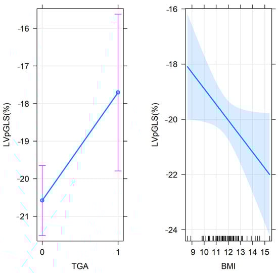 Predictor effect plot for TGA and BMI in the tested multivariable regression model. Note: the graph describes the partial slopes (blue line) for BMI and TGA (groups: 0 = neonates without TGA, and 1 = neonates with TGA), the pointwise confidence band for the regression fitted values (shaded area) and the error bars for the mean values of LVpGLS in the studied groups (neonates with or without TGA). LVpGLS = left ventricle peak longitudinal strain.