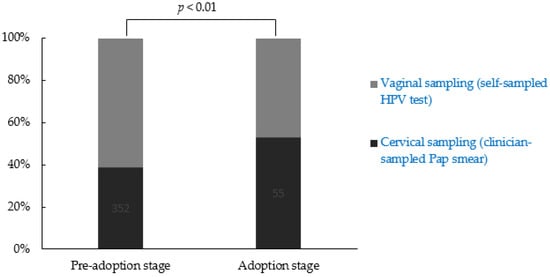 To identify the preferred screening methods for each stage group, data were analyzed using the χ2 test. Compared with the adoption stage group, participants in the pre-adoption stage preferred vaginal sampling when performing cervical screening (χ2: 7.84, p < 0.01) (Figure 1).