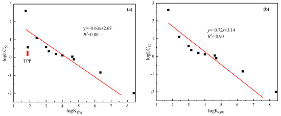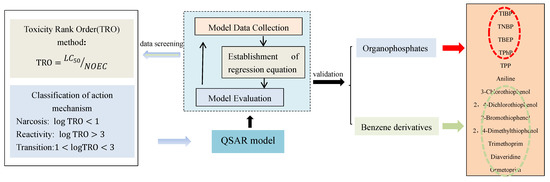 The effectiveness of the established QSAR model for organophosphate esters was analyzed. As shown in Figure 2, the prediction fitting degree of the QSAR model was significantly improved using the TRO method, as evidenced by a higher R2 of 0.90 (Figure 2b) and lower standard deviation of errors of prediction, as compared with the model without the TRO method (Figure 2a, R2 = 0.80). The results showed that the TRO method was feasible and reliable for the identification of model prediction deviation values and for improvement of model validity. In addition, biological toxicity was effectively distinguished by TRO classification. For example, organophosphate ester contaminants (Table 2), exhibited mostly narcosis; biological toxicity was evident when they accumulated to a certain concentration. Studies have shown that tributyl phosphate (TBP), TPP and tris (2-butoxyethyl) phosphate (TBOEP) exhibit similar concentration dependence at the cellular level, while TBP and TBEP are more easily degraded than TPP, leading to different properties and greater toxicity [45]. For anesthetic pollutants, the toxicity was lower, but due to accumulation capability, they can cause a greater impact on organisms.