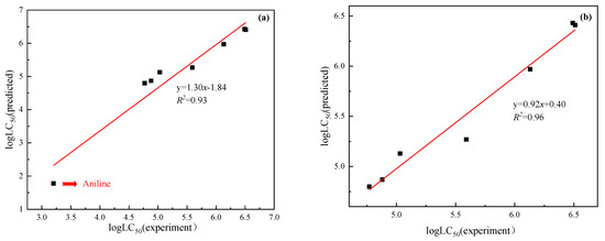 QSAR-model fitting correlation curve between predicted and experimental values of benzene derivatives ((a)—Correlation curve between predicted LC50 and experimental LC50 without TRO method; (b)—Correlation curve between predicted LC50 and experimental LC50 by TRO method; The red line showed the fitting effect of the model).