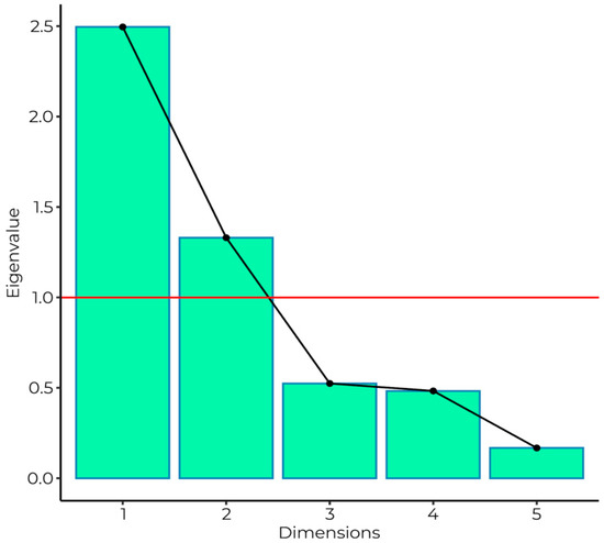 Scree plot illustrating the eigenvalues of subsequent principal components. The Kaiser criterion cutoff point was presented as the red line. Only two first dimensions fulfilled the formal criterion and were included in further analysis.