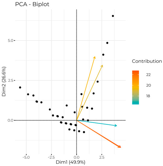 Biplot illustrating the placement of observations and variables on two-dimensional space. Variables (presented as arrows) were filled according to their contribution to the appropriate dimension. Observations were presented as black dots. The names of subsequent dimensions were accompanied by information about the percentage of explained variance in the output data.